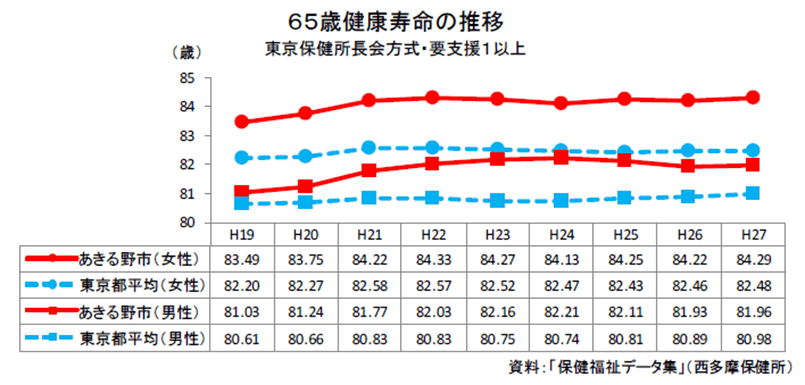 あきる野市の平均寿命は平成27年度時点で女性が86.47歳、男性が81.02歳です。
