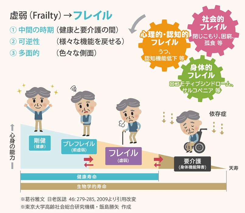 人は健康な状態から「フレイル」という状態を経て、介護を必要とするようなお体の調子になっていくと言われています。
