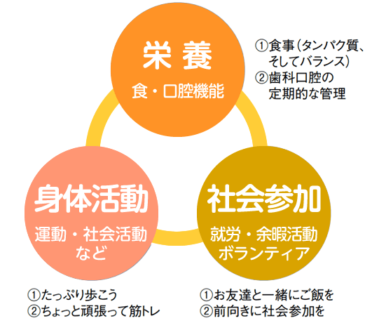 基本的に「栄養」と「身体活動」と「社会参加」の3つの視点から健康に気をつけると良いと言われています。