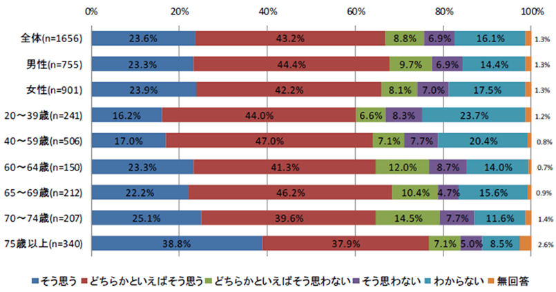 市の調査で、「あなたのお住まいの地域は、困ったときに助け合い、支えあうと思いますか。」という質問をしたところ、「 そう思う・どちらかといえばそう思う」は66.8%で、若い世代(20~39 歳)でも60.2%ありました。