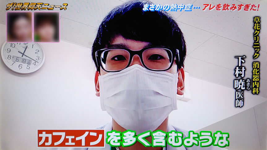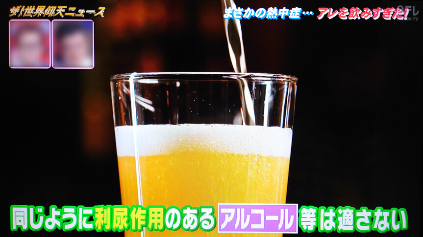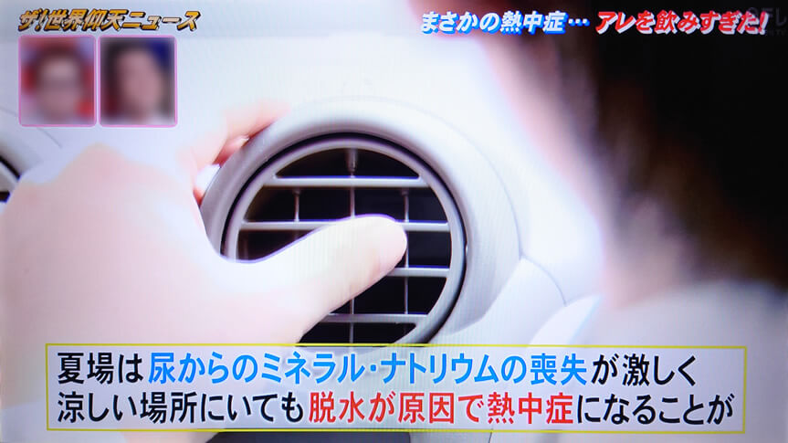 2021年8月17日放送の日本テレビ系列「ザ!世界仰天ニュース」で紹介された『エアコン使用で水分補給しても熱中症になった』事例について、当クリニックが監修しました。