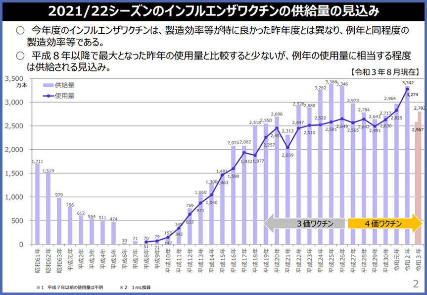 2021年~2022年シーズンのワクチン供給量は、昨年度よりも少ないとされておりますが、例年の使用量に相当する程度は供給される見込みです。以下のグラフをご参照ください。