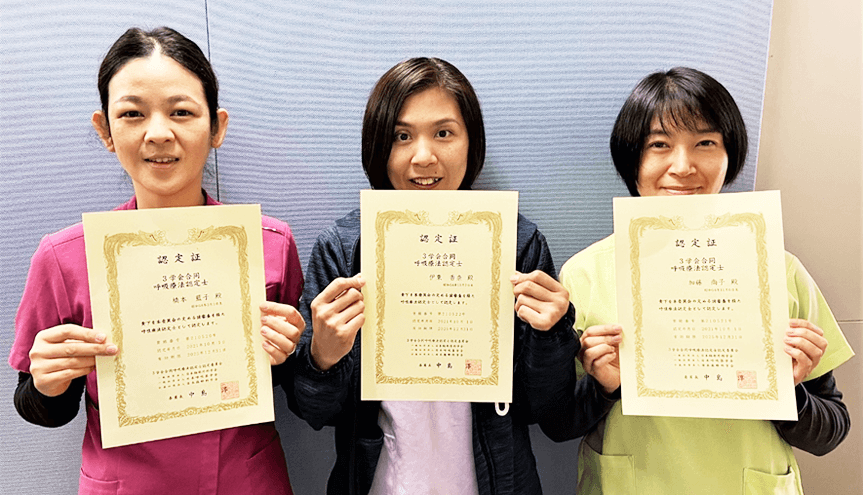 この度、訪問看護課のリハビリスタッフ(理学療法士・作業療法士)に3名の「呼吸療法認定士」が誕生しました!