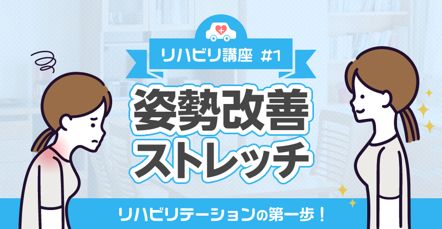 リハビリ講座第一回目は「姿勢改善ストレッチ」です。