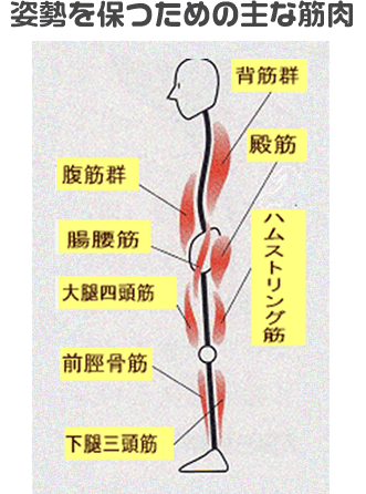 良い姿勢とは、図に書かれている背筋郡や腹筋郡、殿筋などの筋肉がバランスよく使われ、横から見た際に足がまっすぐ伸び、骨盤、上半身、頭が一直線になる状態のことです。