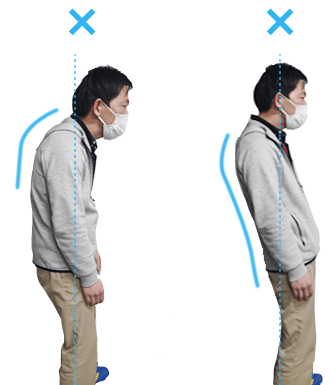 逆に、悪い姿勢は横から見た際に足から骨盤、上半身、頭が一直線にならず、重心が左右にずれ、猫背や反り腰になっているケースがよく見られます。