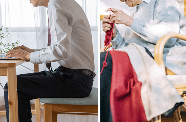 デスクワークや、編み物などで長時間同じ姿勢を取っている方、足を組む癖のある方などは特に注意が必要です。 今回ご紹介するストレッチを行い、姿勢を改善していきましょう。