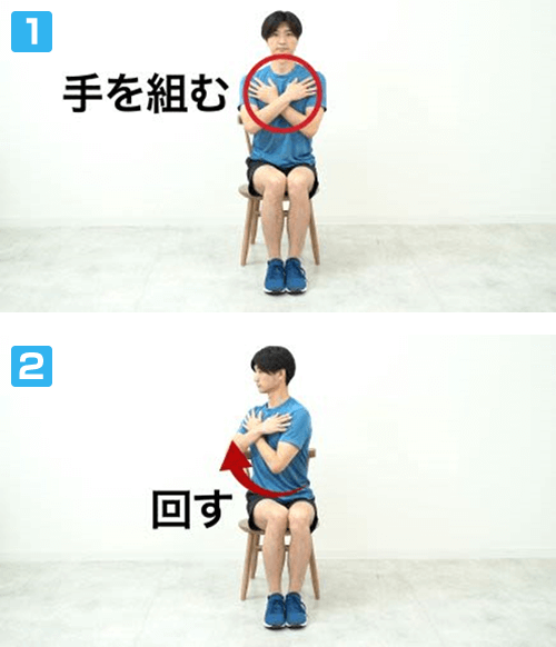 - 息をゆっくり吐きながら行うことで、より上半身を大きく回しやすくなります。息を吸いながら胸を張ると、より大きい動きをしやすくなります。
