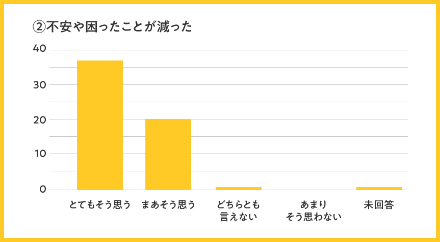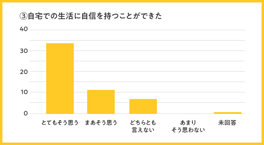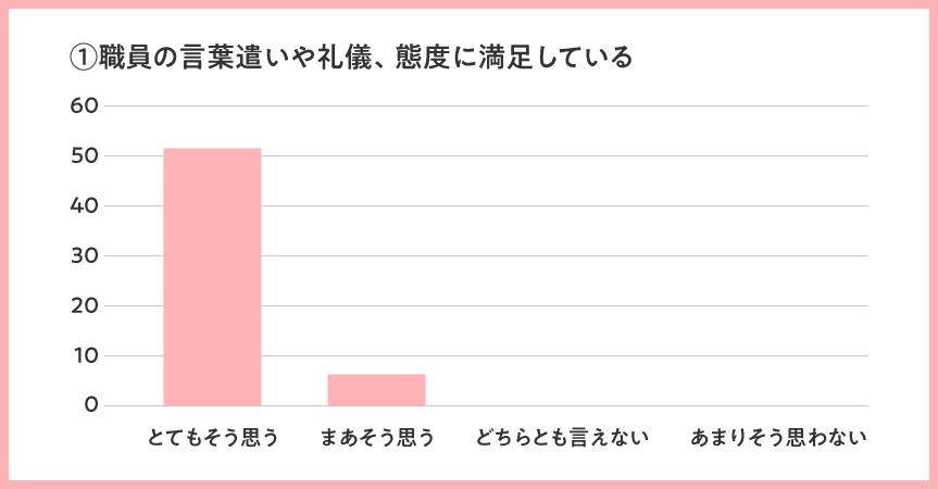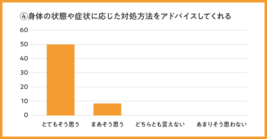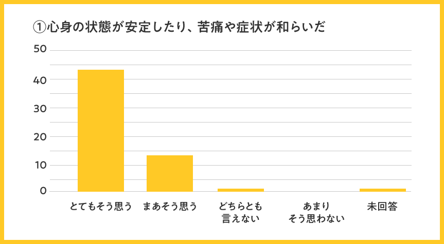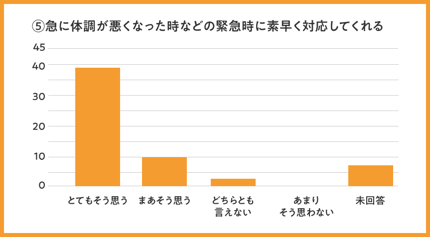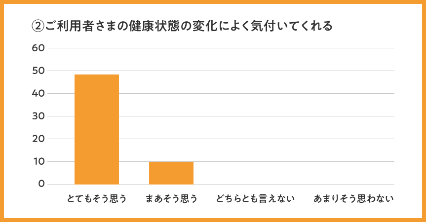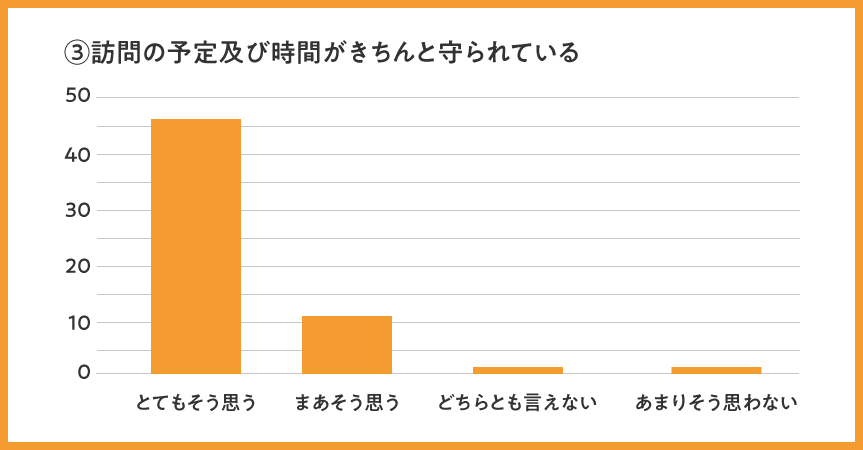 全体として、全項目で「まあそう思う」「とてもそう思う」のプラスイメージ評価が96%と、高評価を頂けましたことを大変嬉しく思います。今後も引き続き、高い評価をいただけるよう訪問看護の質を維持向上して参ります。
