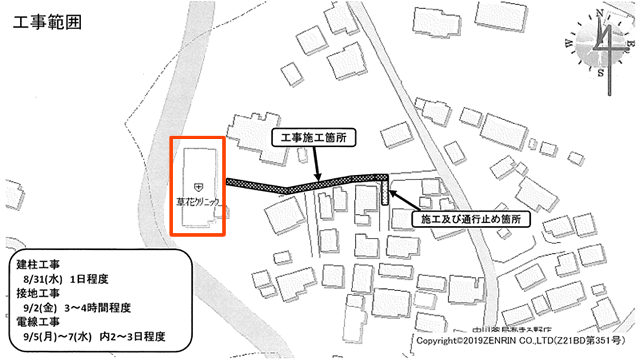 草花クリニックへ通じる道路の一部で電気工事が行われますので、お知らせいたします。