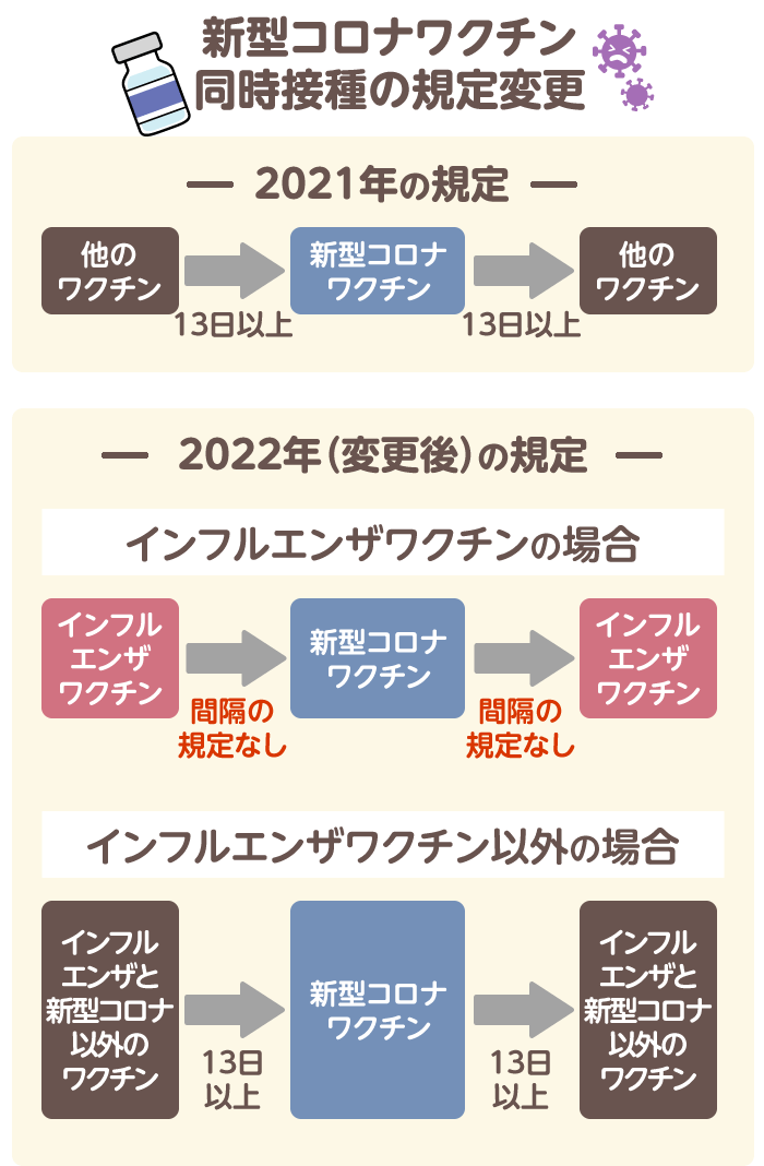 また、昨年までは安全性についての知見が十分でなかったため、新型コロナウイルスのワクチンとインフルエンザワクチンの接種は2週間以上間隔をあける必要がありましたが、今年は「新型コロナウイルスのワクチンとインフルエンザワクチンの同時接種が可能」と厚生労働省から発表がありました。