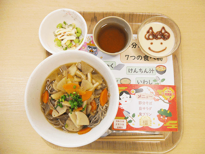 昼食には、行事食として「節分そば」が提供され、皆でおいしくいただきました。