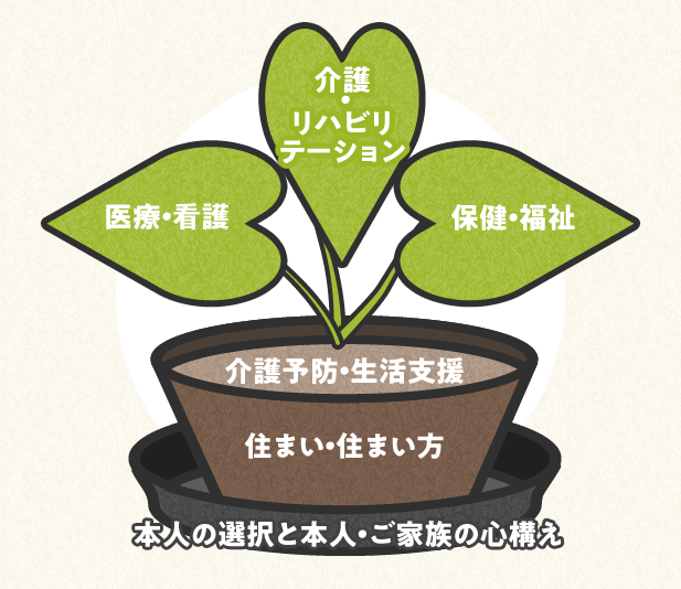 介護予防や生活支援はご本人を下支えする土となり、(1)「医療・看護」(2)「介護・リハビリテーション」(3)「保健・福祉」の3枚の葉を育てます。