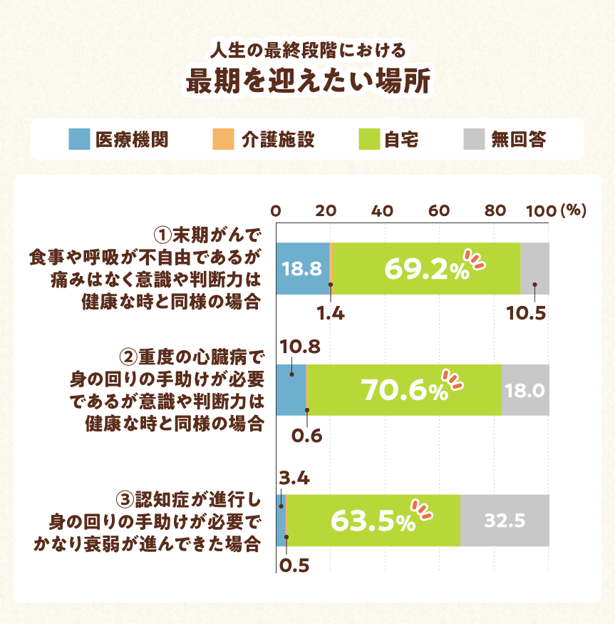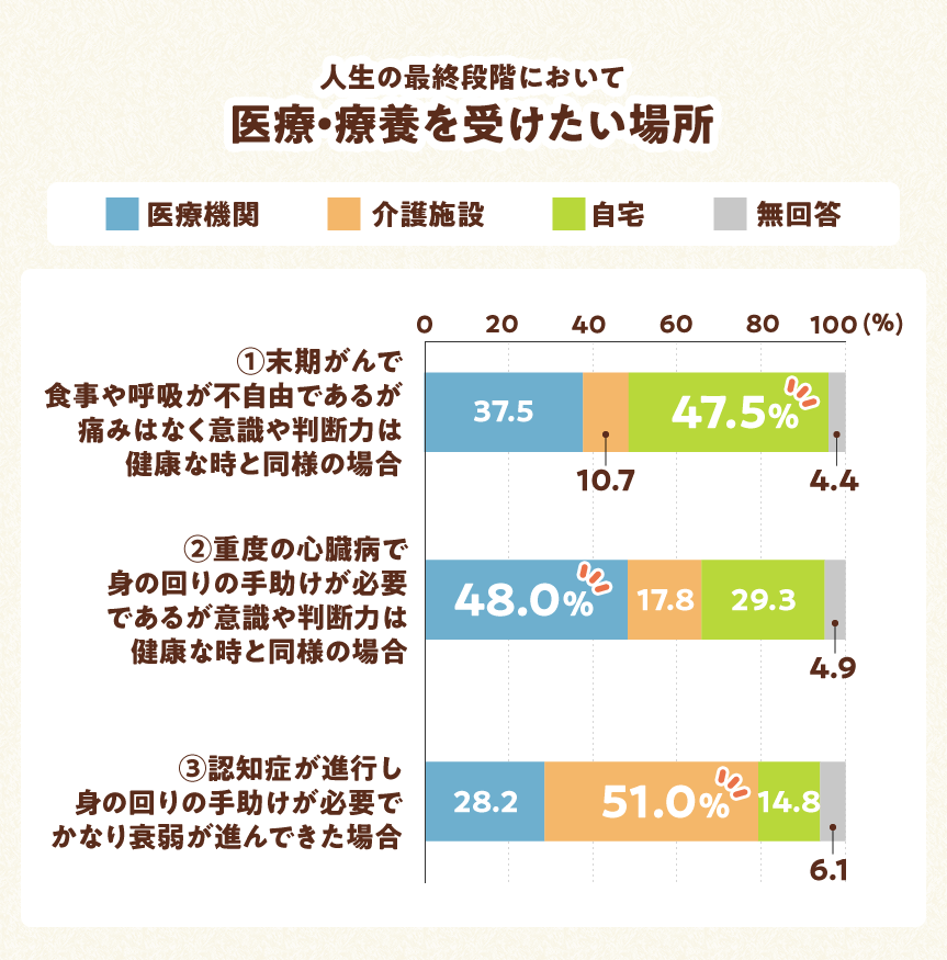 「人生の最終段階において、医療・療養を受けたい場所」という質問では、①末期がんの場合は自宅(47.4%)、②重度の心臓病の場合は医療機関(48.0%)、③認知症の場合は介護施設(51.0%)と状況ごとに意見が分かれるものの、「人生の最終段階における、最期を迎えたい場所」では末期がん、重度の心臓病、認知症、いずれの場合も自宅が多く、60%以上を占めました。