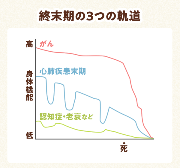 草花クリニック在宅診療の医療の視点では、代表的な疾患の終末期の経過モデル「終末期の疾病の3つの軌道学」を活用しています。