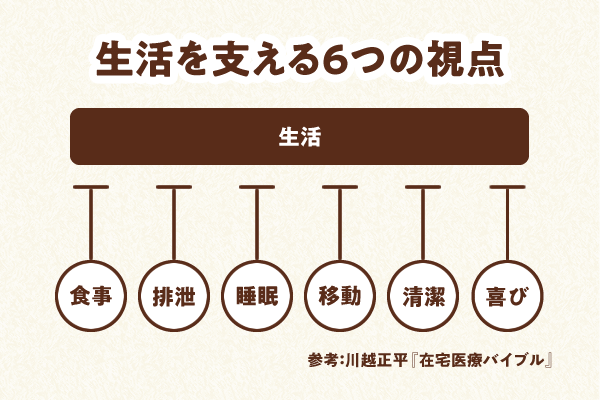 介護の視点では、食事・排泄・睡眠・移動・清潔・喜びの「生活を支える6つの視点」を大切にすることによって、生活の質を保っていきます。