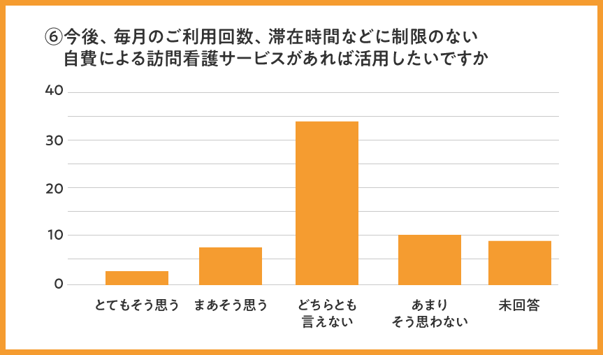 特に「知らない」「どちらとも言えない」の回答が多かった「自費の訪問看護サービス」や「SNSでの情報発信」などの情報提供の面につきましては、アンケート結果を踏まえて今後の方向性を検討してまいりたいと思います。