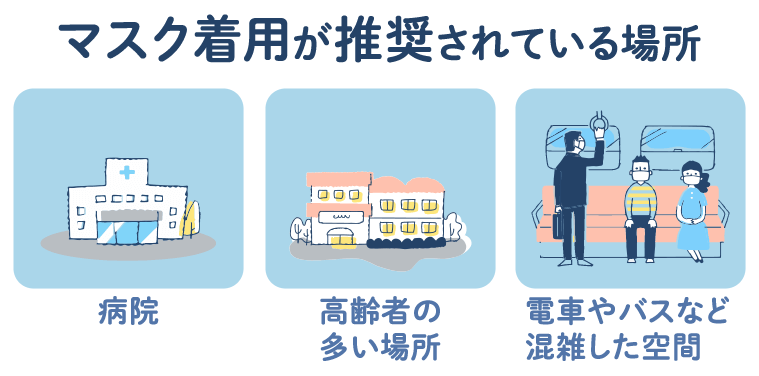3月からマスク着用は個人の判断となっていますが、厚生労働省でも、重症化しやすい高齢者が多い所や電車をはじめとした混雑した空間、病院などでは引き続きマスクの着用を推奨しています。