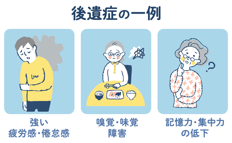 無事回復できても、年齢や症状の軽重を問わず、日常に戻ることが困難な強い疲労感や倦怠感、記憶力・集中力の低下、長期間の発熱や嗅覚・味覚障害などの後遺症が残ることがあり、人によっては改善まで数ヵ月から一年程度かかるケースもあるため、子供から高齢者まで注意が必要です。