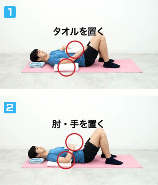 - 仰向けになり、肘の下とお腹の上に、畳んだバスタオルを置きます。
