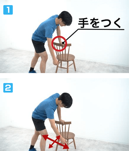 - 動かしにくいと感じる方と反対の手を椅子の背や机などにつき、身体を前傾させましょう。肩の力は抜きます。