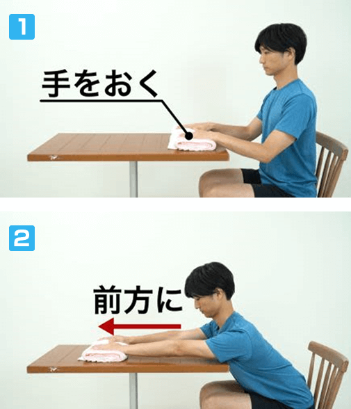 - 机の前に座り、手前にタオルを置きます。手はタオルの上に置いてください。