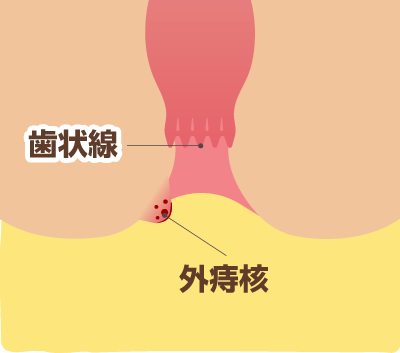 「外痔核」とは、直腸と肛門の境目にある「歯状線」よりも外側にできた痔のことで、排便時のいきみすぎなどが原因で発症します。