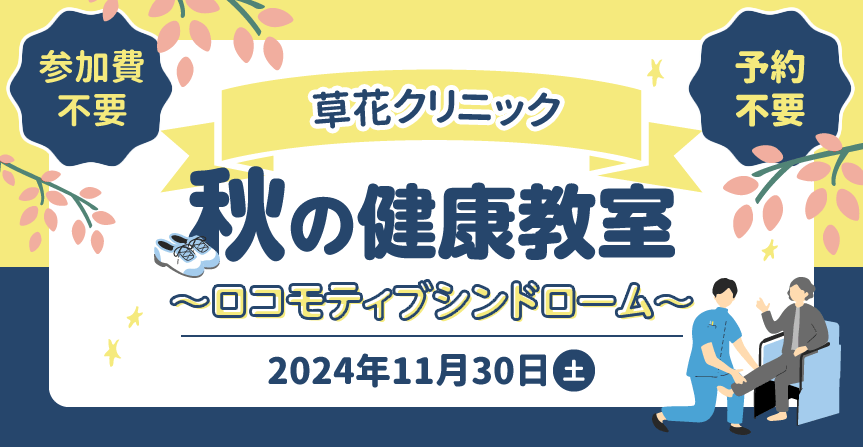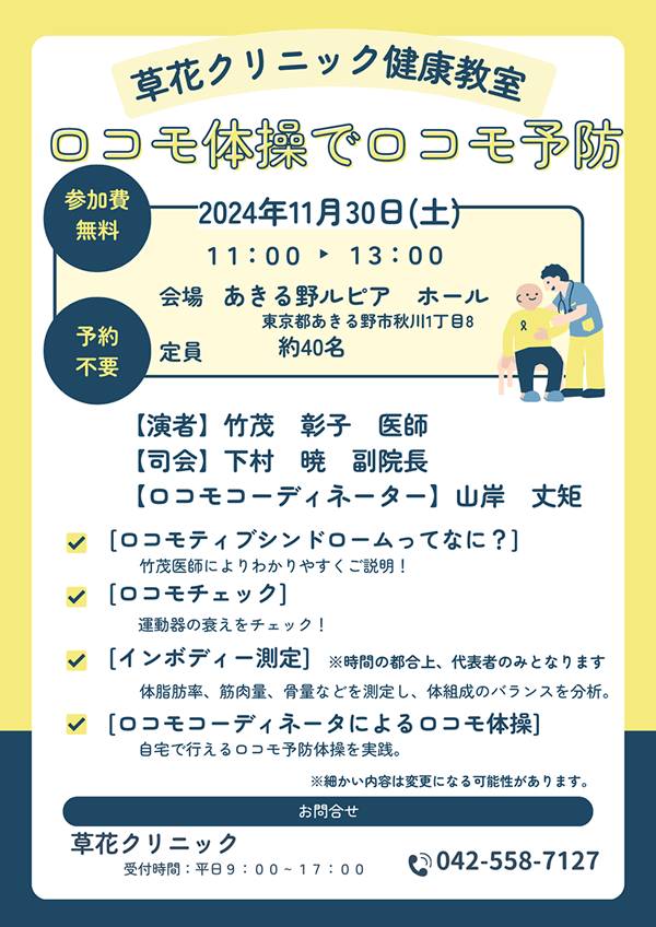 2024年11月30日の11時~13時、あきる野ルピアホールにて、当院主催の健康教室を開催します。