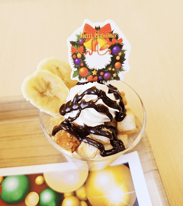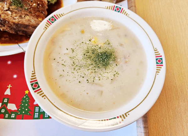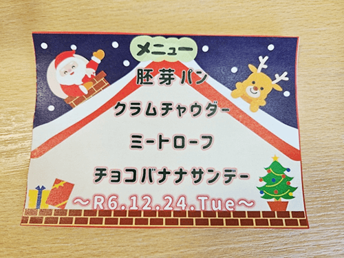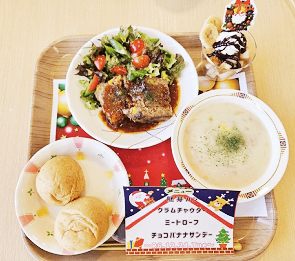 胚芽パンにクラムチャウダー、ミートローフ、デザートにミニチョコバナナサンデーと、賑やかなメニューがクリスマスを華やかに彩ります。