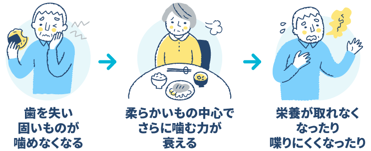 歳を重ねて歯を失ってしまうと段々と硬いものが噛めなくなります。すると、やわらかいもの中心の食生活になって、さらに筋肉が衰え口腔機能が低下する、負の連鎖を引き起こしがち。