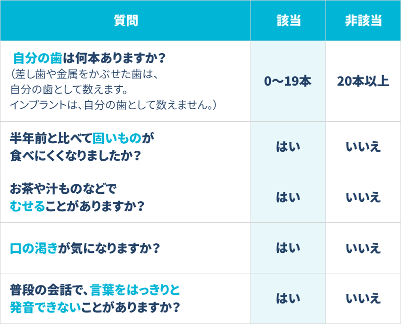 5項目中2項目以上該当するとお口のフレイル「オーラルフレイル」です。