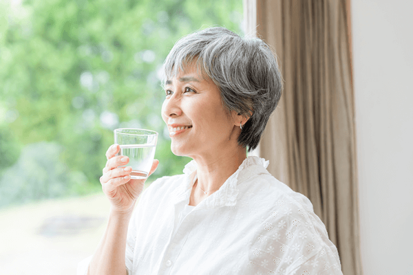 特に高齢の方は喉の渇きを感じにくくなるため、時間を決めて少しずつこまめに水分をとる習慣をつけましょう。