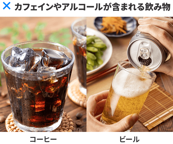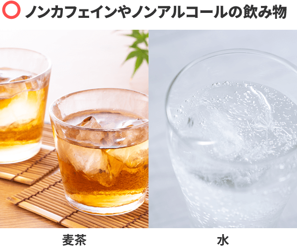 カフェインやアルコールの含まれる飲み物は、利尿作用で飲んだ分以上に水分が出てしまうことがあるため、水分補給とは分けて考えて、別途しっかり利尿作用の少ないノンカフェインやノンアルコールの飲み物をとるようにしましょう。