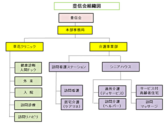 豊信会は大きく医療部門の草花クリニックと介護部門の介護事業部に分かれます。