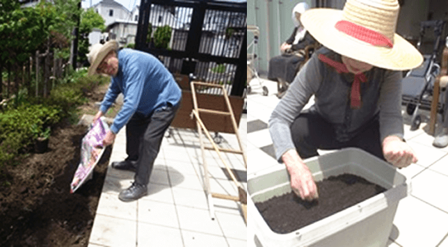 春先の暖かい日に職員と一緒に庭に種まき。元気に育ちますようにと、みなさん楽しそうな笑顔に( ^^)