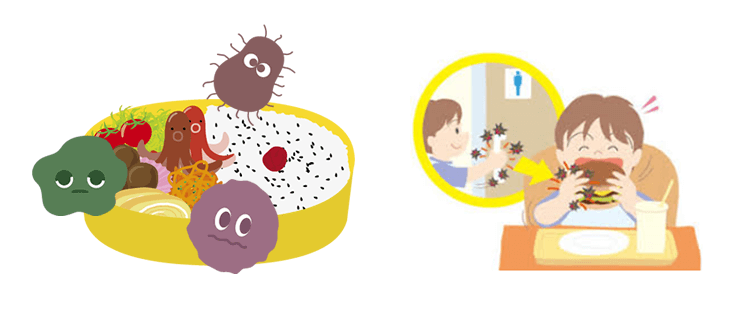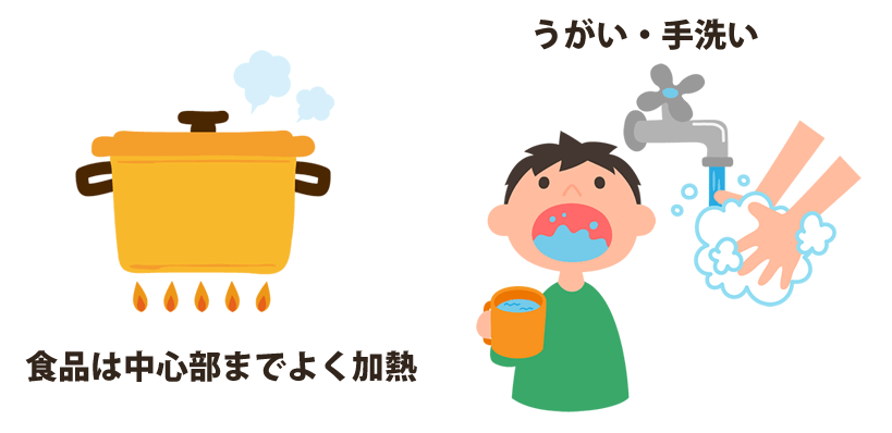 一般的にほとんどのウイルスや細菌は熱に弱いため、食品は中心部までよく加熱しましょう。 - 手洗い・うがいの励行