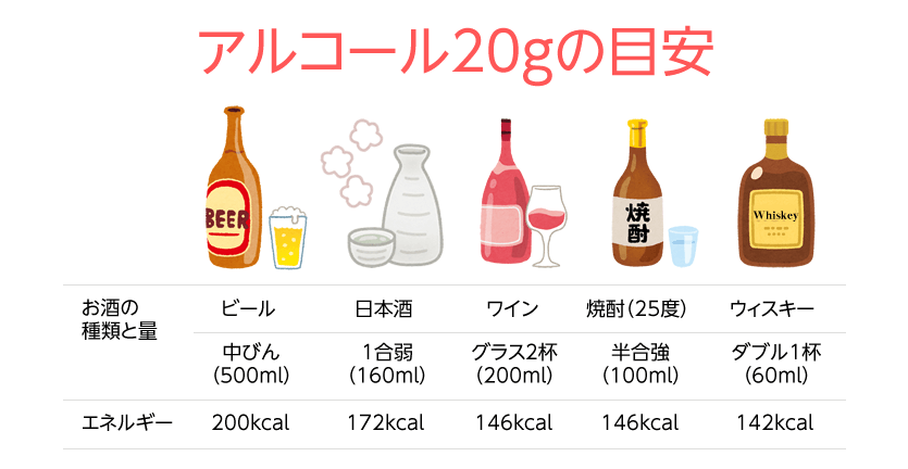 できるだけ控えるようにして、飲む場合でも一日の摂取量は日本酒で一合程度まで(アルコール量:約20g)までにしましょう。