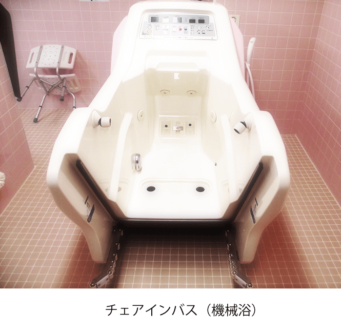 「デイサービスセンターくさばな」では、車いすの方や重度の介護が必要な方でも安心してご入浴いただけるよう、チェアインバス(機械浴槽)による入浴支援をいたしております。