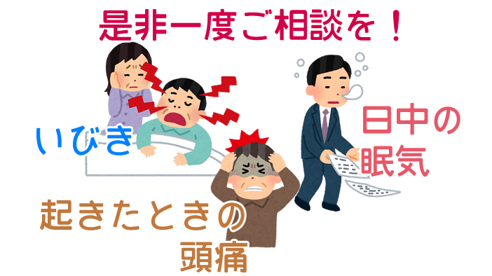 また、仮面高血圧の方の中には、睡眠時無呼吸症候群が原因で、夜間や朝方高血圧となっている場合があります。太り気味で、朝起きたとき頭痛がする、いびきをかく、日中眠気が強いなどの症状のある方は是非一度ご相談ください。