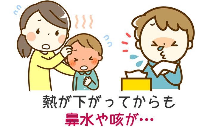 インフルエンザの症状は主に突然の高熱からはじまり、のどの痛みや頭痛、関節痛、手足の痛み、だるさなど全身の症状が強いのが特徴です。 熱は2~3日で下がりますが、その頃から鼻水、咳などの呼吸器の症状が目立ち、完全に体調が戻るまでには1~2週間かかります。