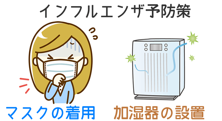 インフルエンザウイルスは乾燥していると増殖しやすいので、濡れタオルや加湿器を設置して部屋の湿度を保ち、正しい手洗いと規則正しい生活習慣を心がけましょう。 そしてインフルエンザの予防策として、マスクを着用することが大変効果的です。