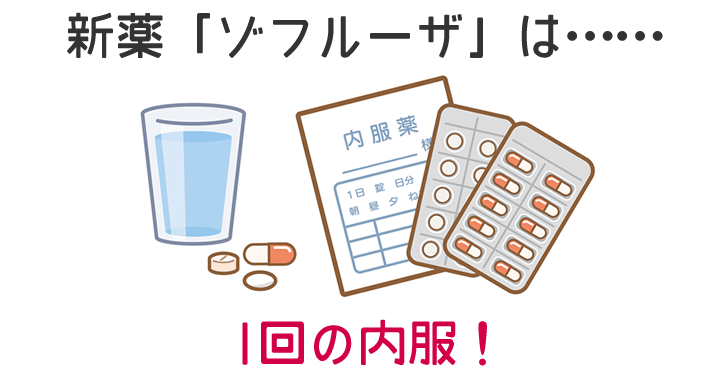 今年、新薬「ゾフルーザ」が発売されました。 このゾフルーザは細胞内でウイルスそのものが増えないようにする働きがあり、1回の内服で済むのが最大の特徴です。また体内にウイルスがとどまる時間も短くなるとされていて、周りの方への感染拡大予防にも効果的です。1回なのでお薬の飲み忘れが少なくなっていいですね。